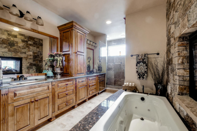 Bathroom 2 – toilet , shower , jetted tub , Two way gas fireplace adjacent to jetted tub